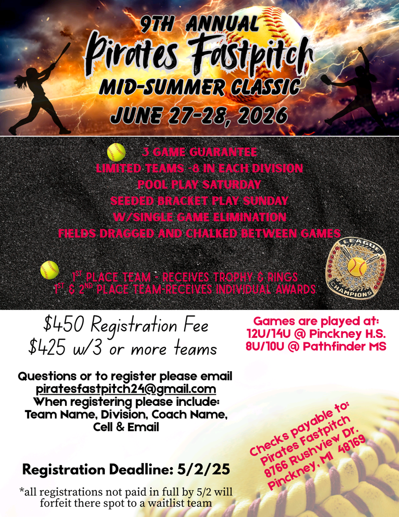 We still have limited space in some age groups, please reach out to PiratesFastpitch24@gmail.com for availability.